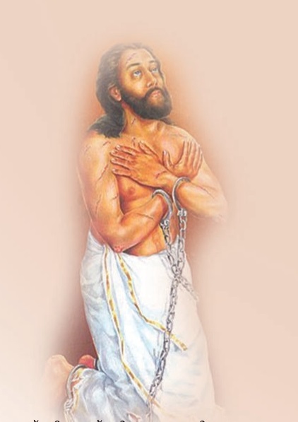 കാരാഗൃഹത്തിലടയ്ക്ക പ്പെട്ട ദേവസഹായംപിള്ള, തൻ്റെ മുഖത്തു തുപ്പുകയും ചമ്മട്ടികൊണ്ട് അടിക്കു കയും മുൾമുടി അണിയി ക്കുകയും പരിഹസിക്കു കയും ചെയ്ത‌വരോട് പരി