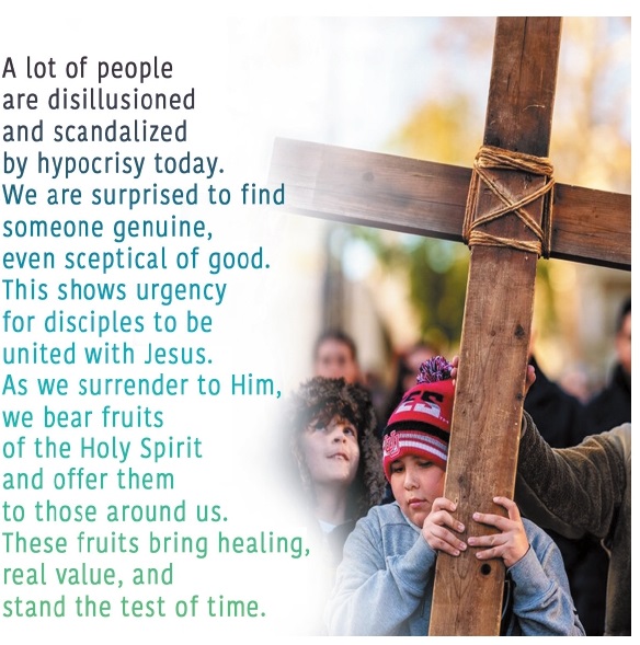 one standard before us the bearing of the fruit of the Holy Spirit. St Paul enlightens us with this listing: “The fruit of the Holy Spirit is love, joy, peace, patience, kindness, generosity, faithfulness, gentleness and self-control” (Gal 5:22,23). These qualities are called as “fruits” because they are the manifestations of the presence and power of the Holy Spirit. When there are apples on a tree, we would call that tree as an apple tree. An apple tree can only produce apples. Apples are the manifestations of an apple tree. So also, when the disciples of Jesus are anointed with the Holy Spirit, the fruit of the Spirit will be manifested in their lives.