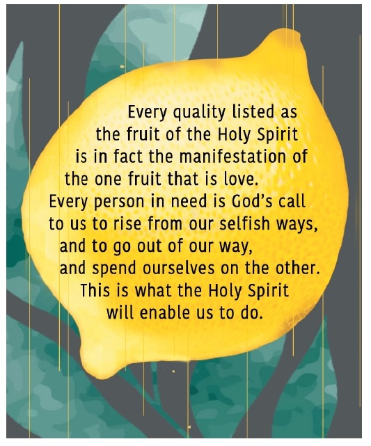 any of his possessions was his own, but they had everything in common. With great power the apostles bore witness to the resurrection of the Lord Jesus, and great favour was accorded them all. There was no needy person among them, for those who owned property or houses would sell them, bring the proceeds of the sale, and put them at the feet of the apostles, and they were distributed to each according to need” (Acts 4:32-35). It is interesting that while St Paul is listing out the many qualities of the anointing, he describes these not as the “fruits” but in the singular as the “fruit” of the Holy Spirit. We understand that the fruit of the Holy Spirit is love. The Lord had taught, “This is how all will know that you are my disciples, if you have love for one another” (Jn 13:35). In that famous thirteenth chapter of his letter to